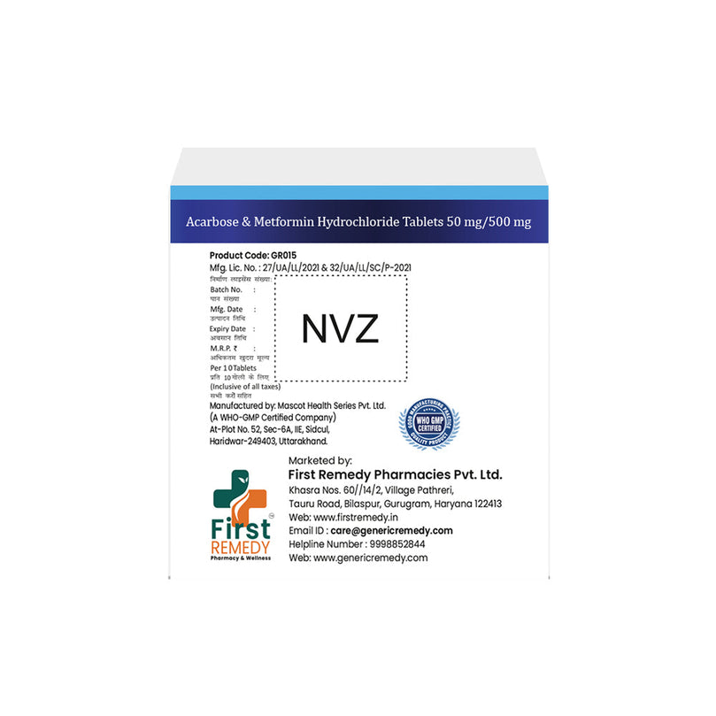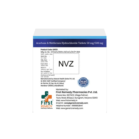 Acarbose 50 mg & Metformin 500 mg Tablet contains two active ingredients: Metformin (a biguanide) and Acarbose (an alpha-glucosidase inhibitor). Metformin reduces hepatic glucose production, improves insulin sensitivity, and decreases intestinal glucose absorption. Acarbose slows the digestion and absorption of carbohydrates by inhibiting intestinal enzymes, leading to a gradual rise in blood sugar after meals.