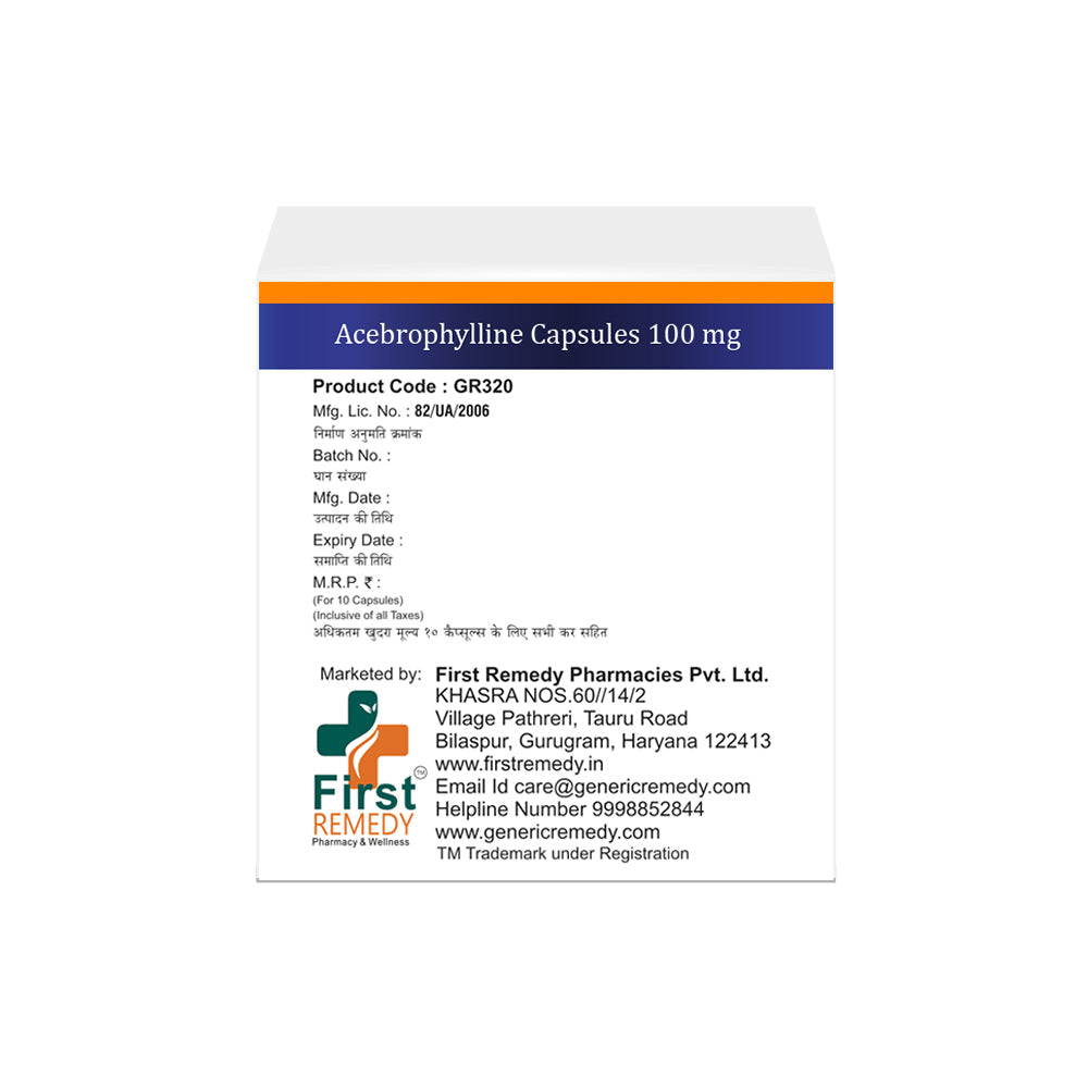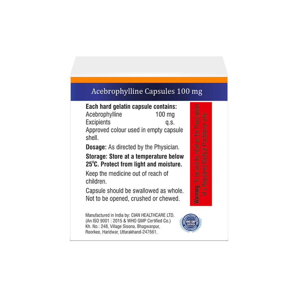 Acebrophylline 100 mg Capsules IP is a mucoactive agent with bronchodilator properties, used for the maintenance treatment and prevention of symptoms in chronic respiratory conditions such as asthma, chronic obstructive pulmonary disease (COPD), and bronchitis.