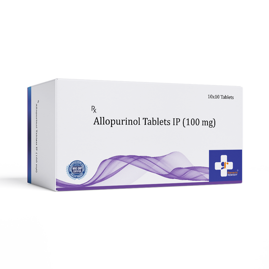 Allopurinol Tablets IP 100 mg belongs to a class of medications called xanthine oxidase inhibitors, primarily used to decrease blood uric acid levels. It is used to treat chronic gout (a form of arthritis caused by uric acid crystal buildup in joints, leading to pain and inflammation) and to prevent uric acid-related kidney stones. It is not for acute gout attacks or asymptomatic hyperuricemia.