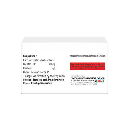 Baclofen 20mg Extended Release Tablet is used to reduce and relieve muscle spasms (involuntary, excessive muscle contractions) associated with various neurological conditions. Muscle spasms can be painful and uncomfortable, and often occur when nerve signals controlling muscle movements are impaired or disrupted.