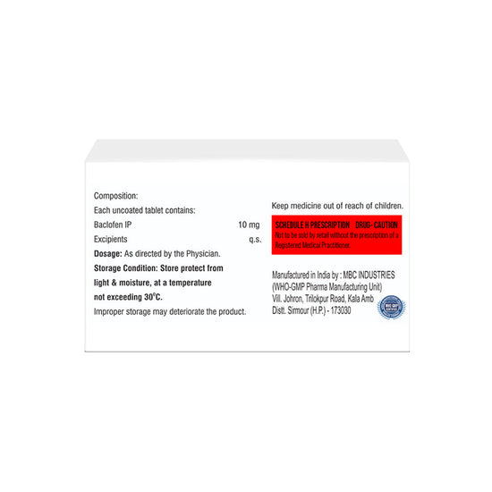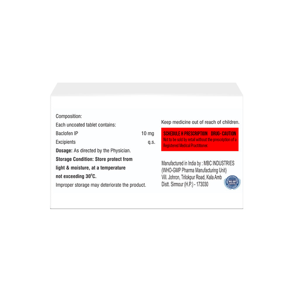Baclofen Tablets IP 10 mg belong to a class of medicines called muscle relaxants (specifically, GABA-B receptor agonists). They are used to reduce and relieve muscle spasms (spasticity or excessive muscle tension) associated with neurological conditions. Muscle spasms occur due to sudden, involuntary contractions, often caused by damage or interruption of nerve impulses controlling muscle movements, leading to pain, stiffness, and reduced mobility.