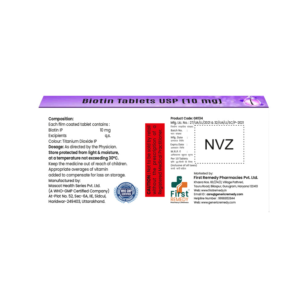 Biotin 10mg Tablets IP contains Biotin. Biotin 10mg Tablets promote healthy hair growth and prevent hair loss by boosting keratin levels, an essential protein that forms hair, skin, and nails. Thus, Biotin 10mg Tablets improve the hair structure, hair colour, strengthen the hair, and increase the hair's resistance to mechanical and chemical damage.