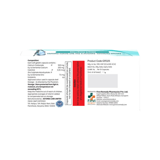 Calcium Carbonate 500 mg, Calcitriol 0.25 mcg & Zinc 7.5 mg Capsules IP is a nutritional supplement combining a calcium source, the active form of vitamin D, and an essential trace mineral, primarily used to treat and prevent calcium and vitamin D deficiencies, as well as associated bone disorders.