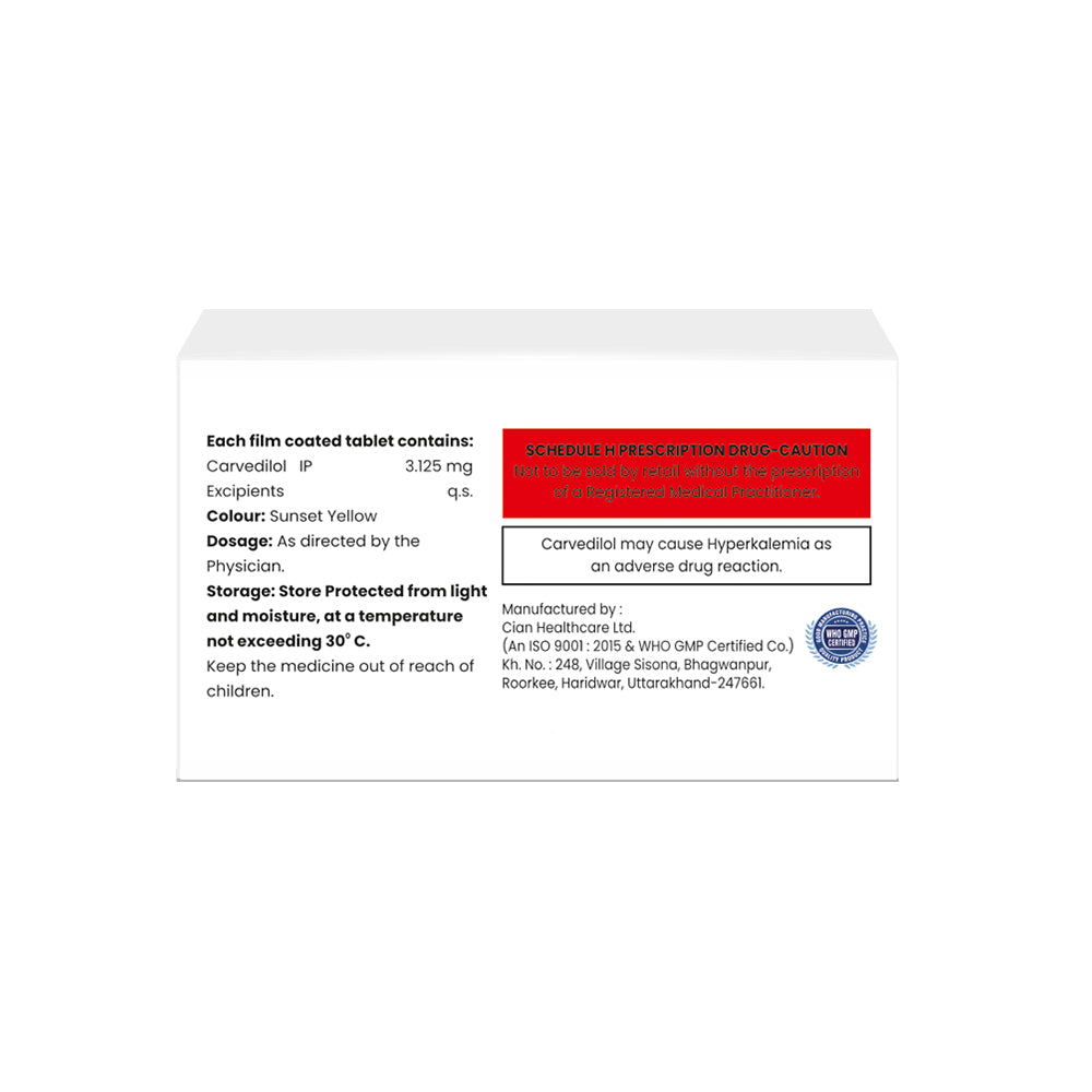 Carvedilol Tablets IP 6.25mg contains Carvedilol that works by blocking the action of certain natural substances in your body. It lowers blood pressure and helps reduce the risk of stroke, heart attack, and other future heart-related problems.