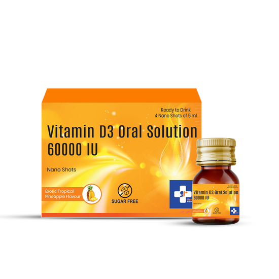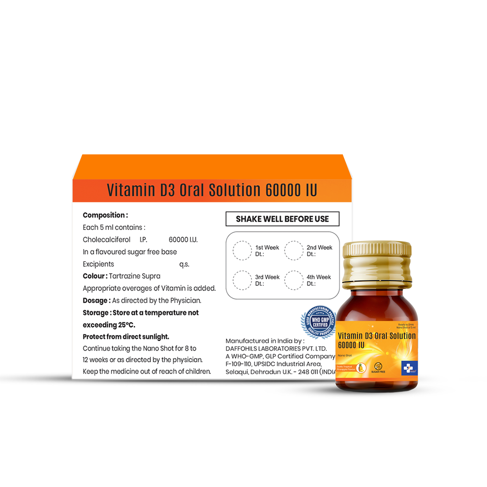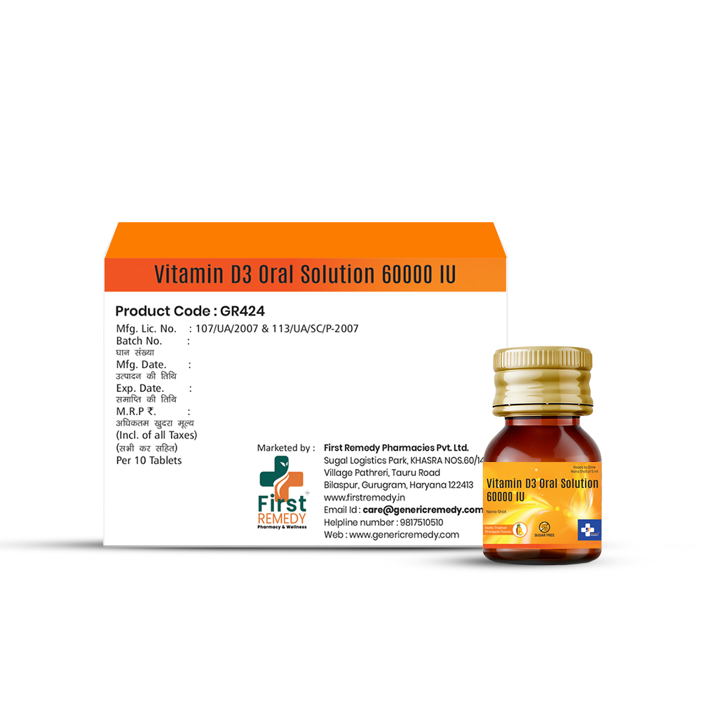 Cholecalciferol (Vitamin D3) 60,000 IU Solution 5 ml IP is a high-potency oral supplement containing 60,000 international units (IU) of cholecalciferol. The natural form of vitamin D is synthesized in the skin via sunlight exposure. It is prescribed to treat and prevent vitamin D deficiency, which can result from inadequate dietary intake, malabsorption, limited sun exposure, or increased needs (e.g., in obesity, renal disease).