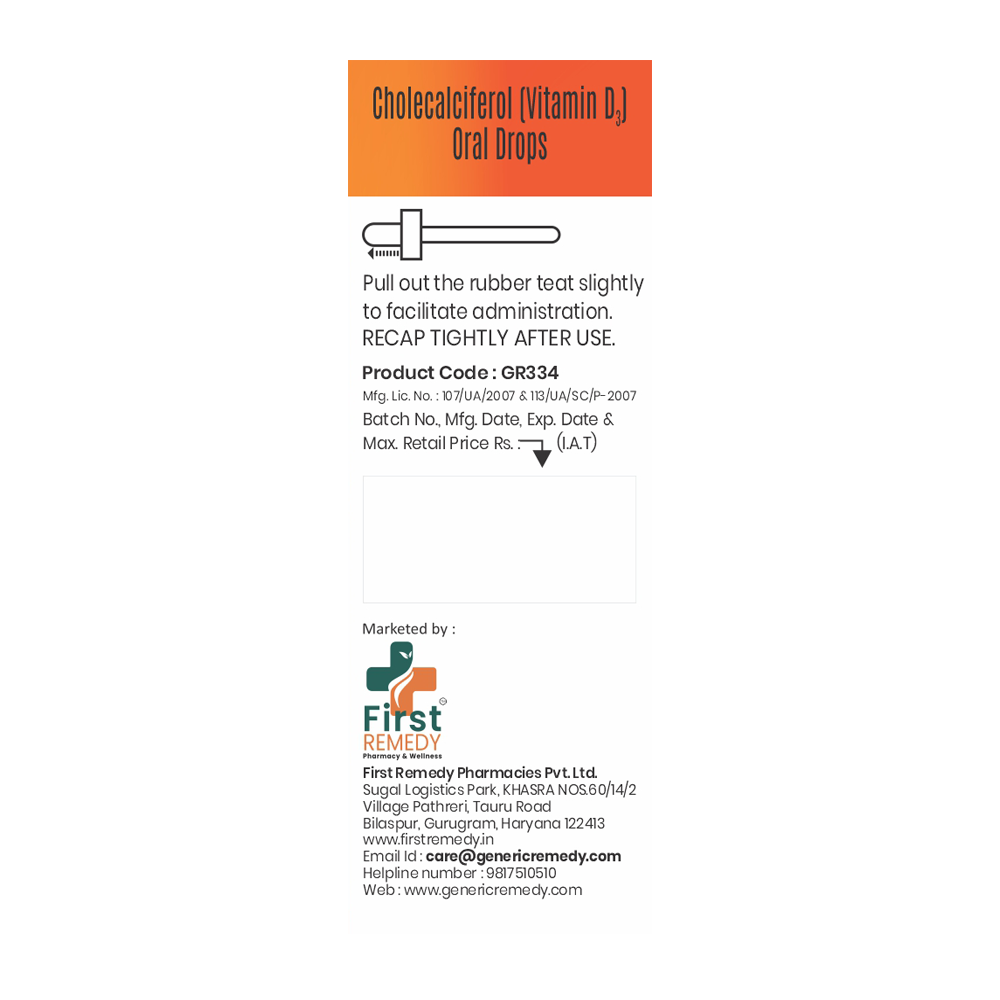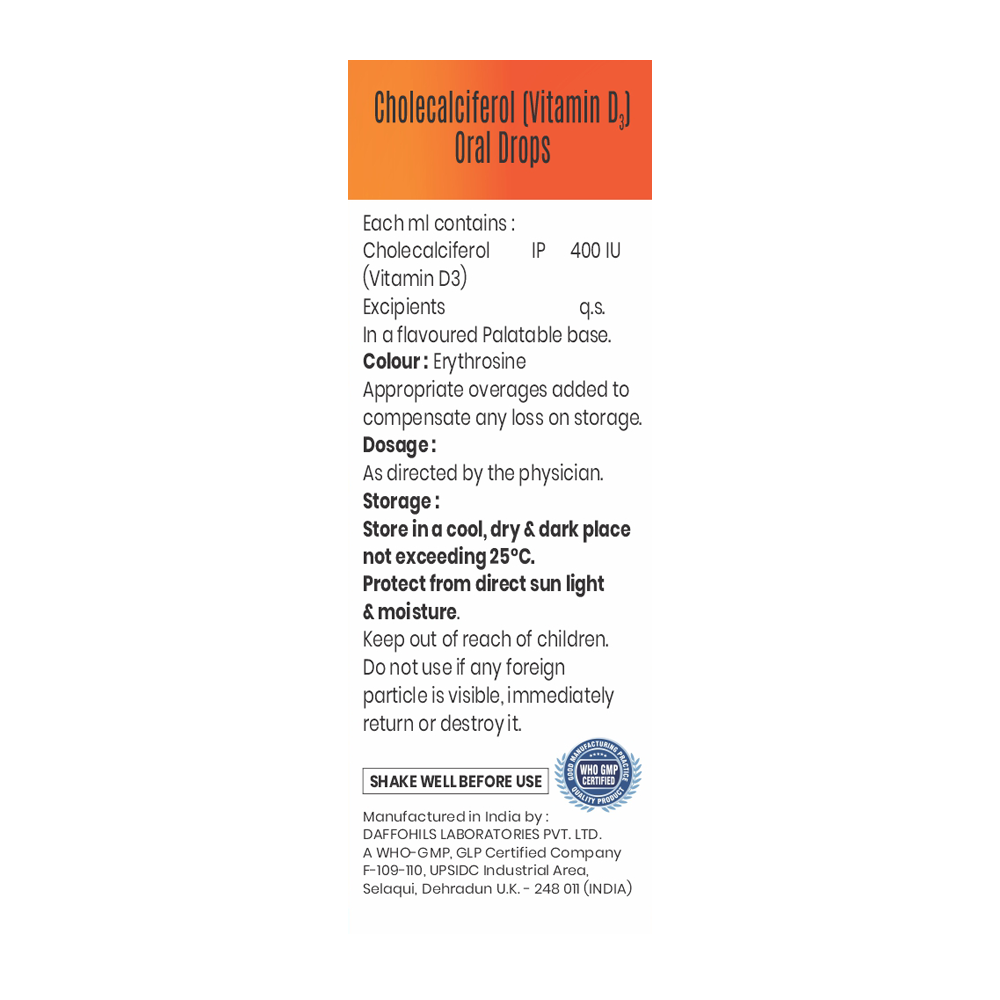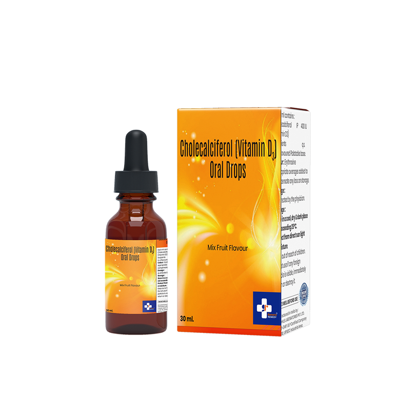Cholecalciferol (Vitamin D3) Drops 400 IU per ml IP 30ML is an oral vitamin supplement, most commonly used to prevent and treat vitamin D deficiency in infants and young children. It is also suitable for adults and the elderly who have difficulty swallowing tablets.