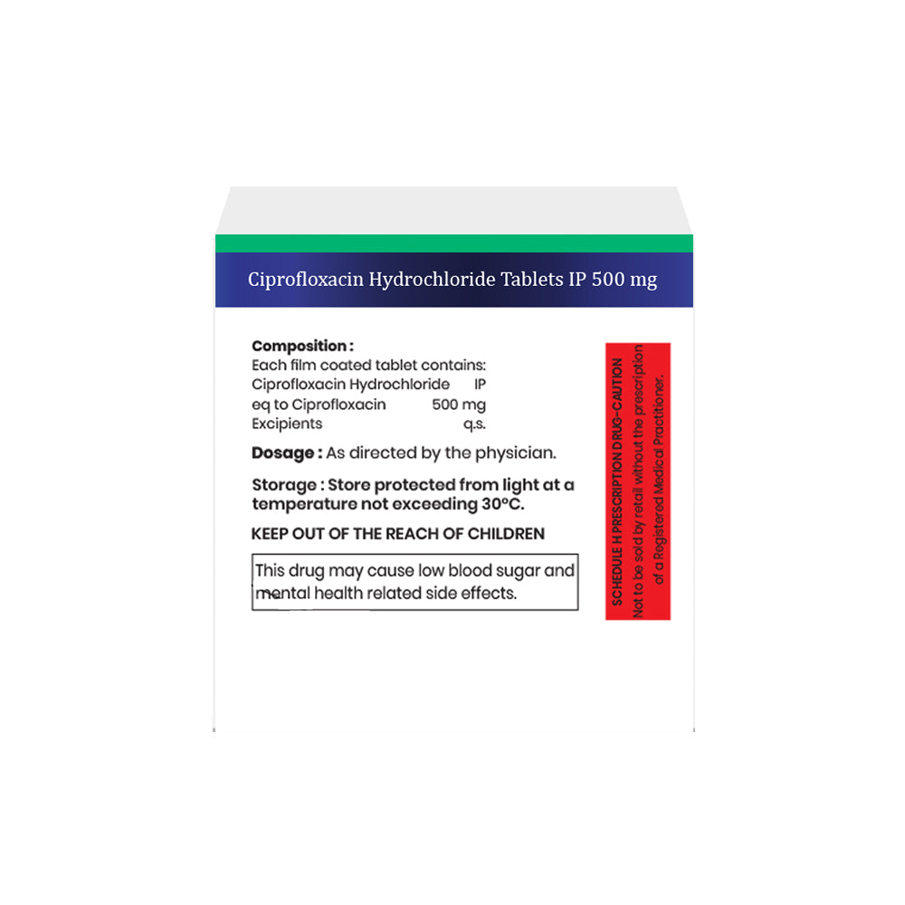 Ciprofloxacin Hydrochloride Tablets IP 500 mg is an antibiotic used to treat or prevent certain bacterial infections. It is prescribed for conditions such as pneumonia, gonorrhea (a sexually transmitted infection), typhoid fever, infectious diarrhea, and infections of the skin, bones, joints, abdomen, and prostate.