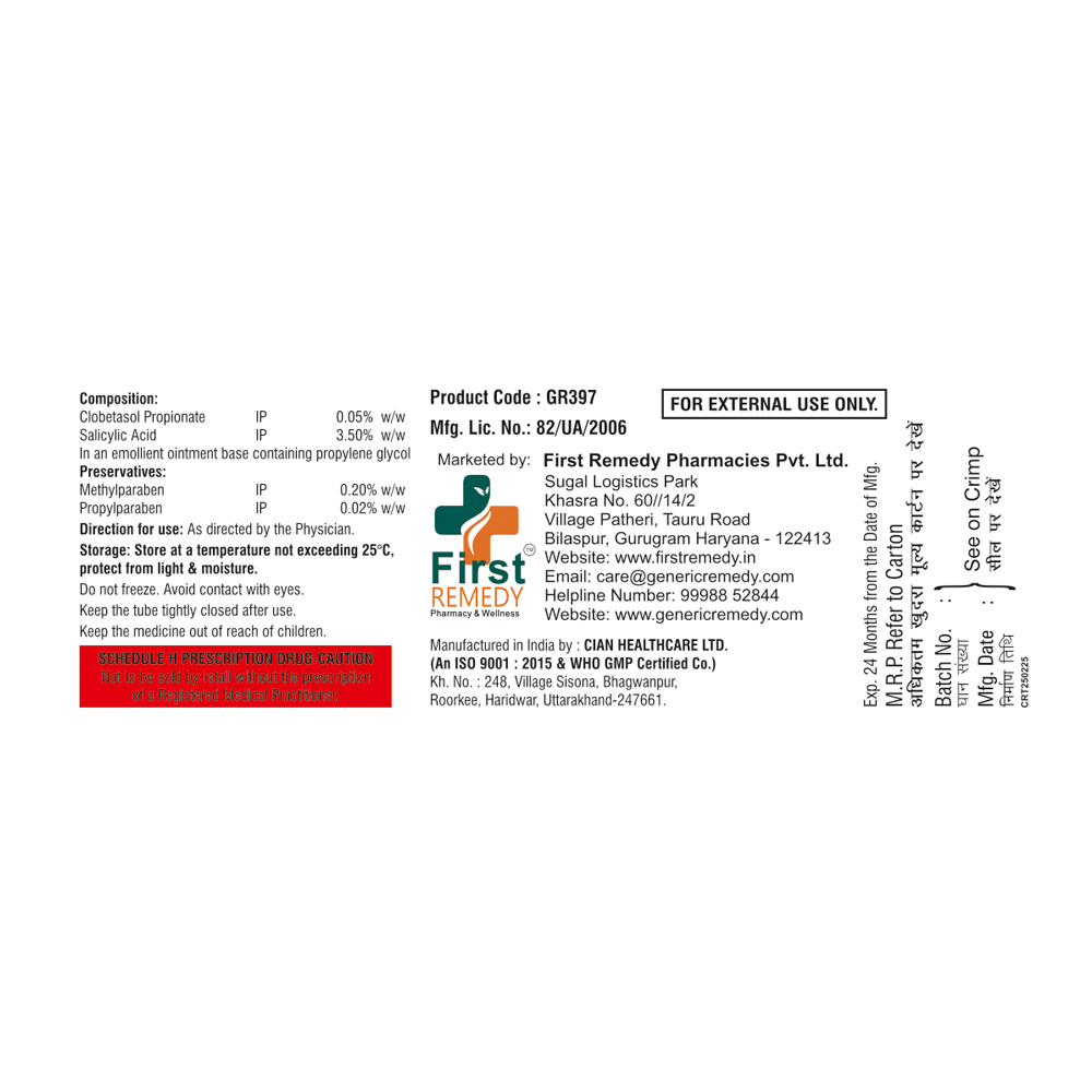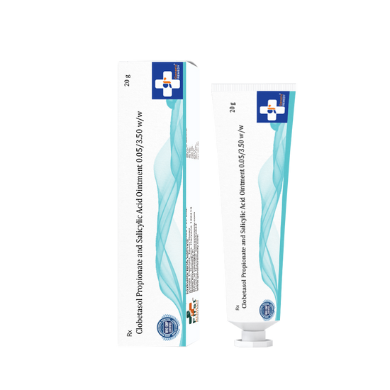 Clobetasol Propionate 0.05% w/w & Salicylic Acid 3.50% w/w Ointment IP is a super-potent topical corticosteroid combined with a keratolytic agent, used to treat inflammatory and hyperkeratotic skin conditions such as eczema (atopic dermatitis) and psoriasis.