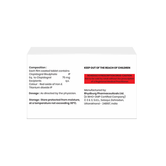 Clopidogrel Tablets IP 75 mg play a vital role in preventing the formation of harmful blood clots in your blood vessels by making platelets (clotting agents) stick together. Thus, it helps to reduce the risk of heart attack, stroke, unstable angina (heart-related chest pain), and peripheral arterial disease (blocked or poor blood flow due to narrowed blood vessels) in heart disease patients and patients who have undergone recent heart surgery with a stent.
