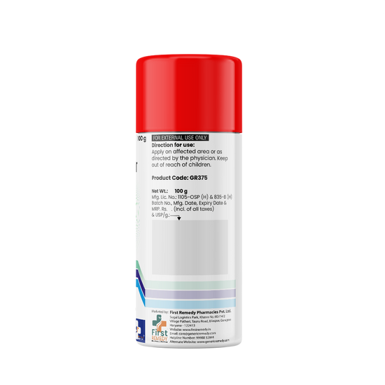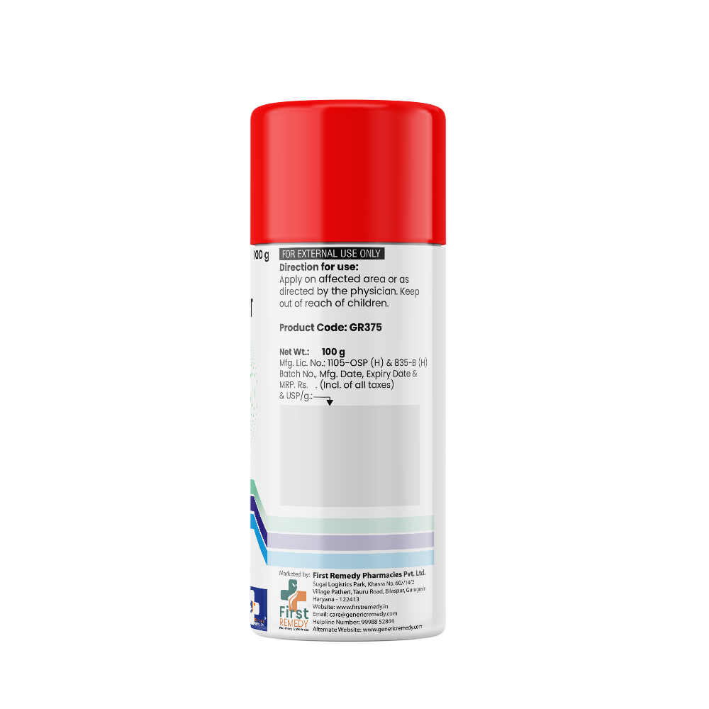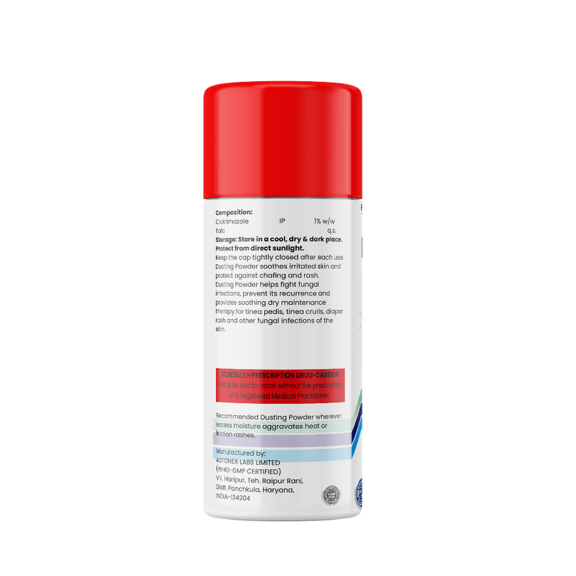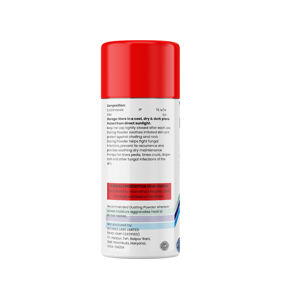 Clotrimazole Powder 1% IP 100 gm is a topical antifungal dusting powder containing 1% w/w clotrimazole, an imidazole derivative, used to treat and prevent superficial fungal skin infections caused by dermatophytes, yeasts (e.g., Candida), and other susceptible fungi. It is particularly effective in moist, occluded areas where fungi thrive, such as intertriginous regions (skin folds). The powder formulation absorbs excess moisture, reduces friction, and delivers the antifungal agent directly to the affected site with minimal systemic absorption (<10%).