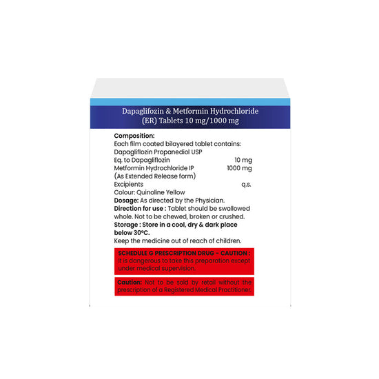 Dapagliflozin 10mg & Metformin Hydrochloride 1000mg Tablet contains two antidiabetic medicines: Metformin and Dapagliflozin. These drugs lower the blood sugar levels in type 2 diabetes mellitus by eliminating excess sugar through urine and also by increasing the activity of insulin.