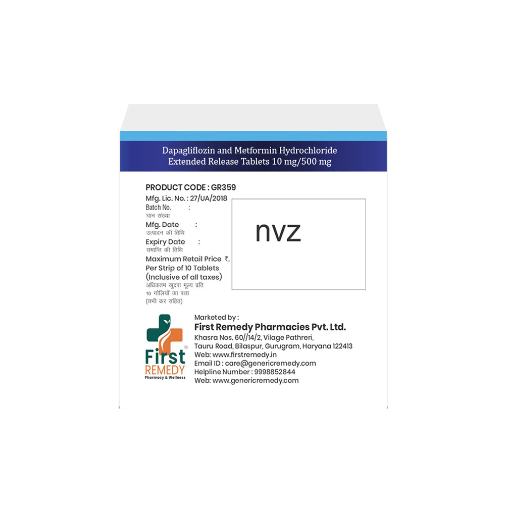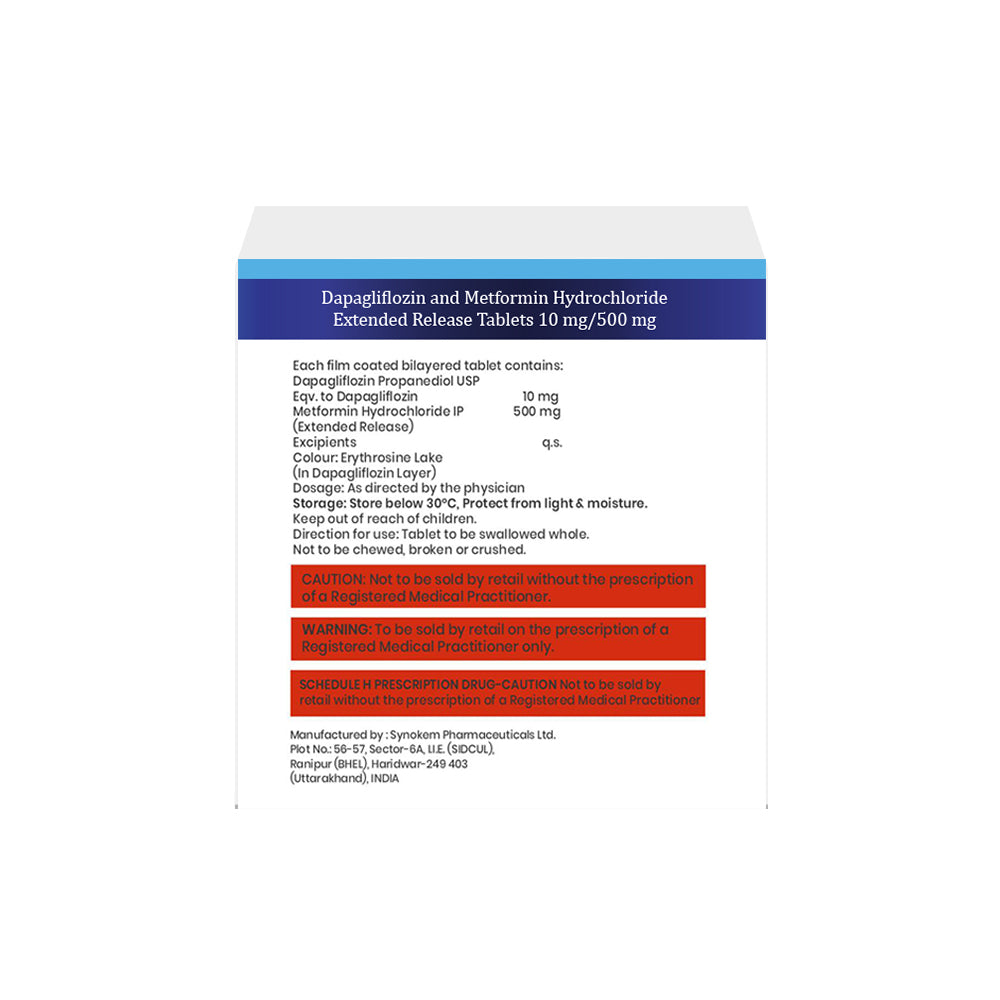 Dapagliflozin 10mg & Metformin Hydrochloride Extended Release 500mg Tablet is a combination antidiabetic medication primarily used to treat type 2 diabetes mellitus alongside a proper diet and exercise regimen. This combination helps control blood sugar levels and reduces the risk of heart failure in patients with type 2 diabetes and established cardiovascular disease. Diabetes mellitus is a metabolic disorder characterized by elevated blood glucose levels due to insulin resistance or insufficient insulin production by pancreatic beta cells. This medication is not indicated for type 1 diabetes mellitus or diabetic ketoacidosis.