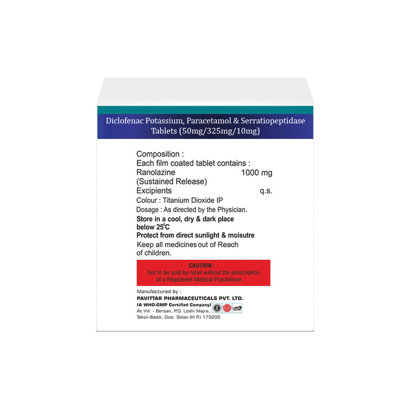 Diclofenac Potassium 50 mg, Paracetamol 325 mg & Serratiopeptidase 10 mg Tablet IP is a fixed-dose combination medication intended for the short-term management of pain and inflammation. It is commonly prescribed for conditions such as osteoarthritis, rheumatoid arthritis, ankylosing spondylitis, muscle pain, joint pain, dental pain, postoperative pain, and other inflammatory conditions.