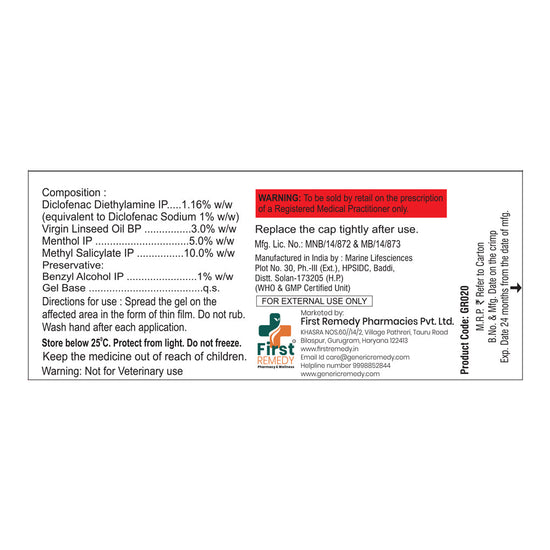 Diclofenac, Linseed Oil, Methyl Salicylate & Menthol Gel 30 gm is a topical non-steroidal anti-inflammatory drug (NSAID) formulation used for short-term relief of acute musculoskeletal pain (e.g., strains, sprains, back pain) and pain associated with osteoarthritis of superficial joints (e.g., knees, hands). It helps reduce localized pain, swelling, inflammation, and stiffness, improving joint mobility without significant systemic absorption when used as directed.