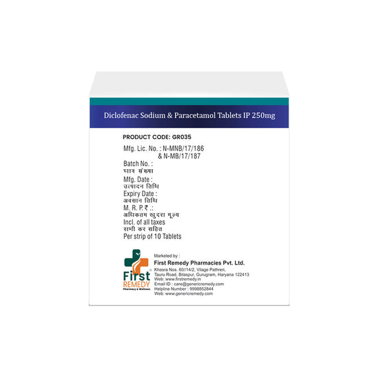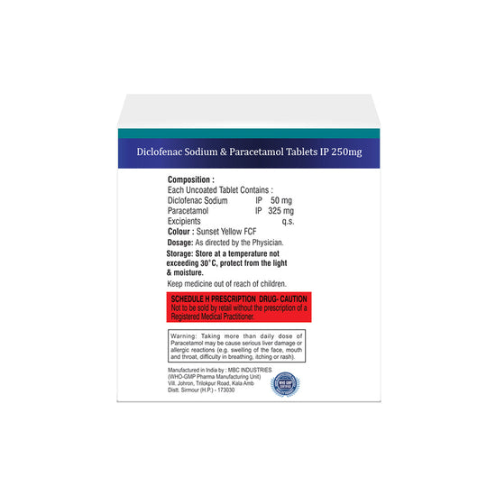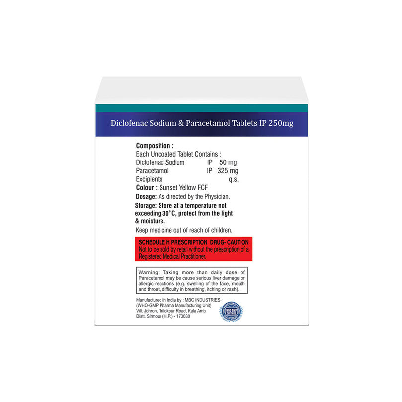 Diclofenac Sodium 50 mg & Paracetamol 325 mg Tablet IP is a fixed-dose combination of diclofenac (a non-steroidal anti-inflammatory drug [NSAID]) and paracetamol (acetaminophen, an analgesic and antipyretic).