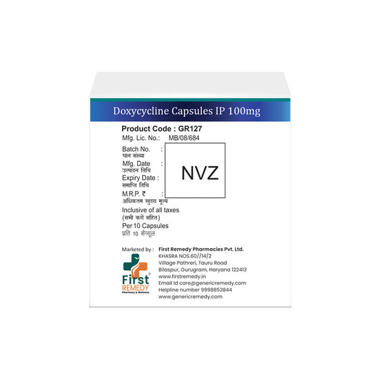 Doxycycline Capsules IP 100 mg is a broad-spectrum antibiotic from the tetracycline class, combined with lactic acid bacillus (a probiotic) to support gut health.