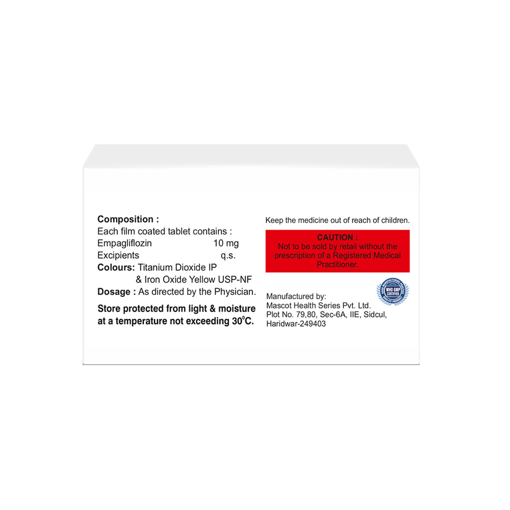 Empagliflozin Tablet 10 mg IP is an oral sodium-glucose co-transporter 2 (SGLT2) inhibitor used to improve glycemic control in adults with type 2 diabetes mellitus (T2DM), reduce cardiovascular (CV) risks in T2DM with established CV disease, lower heart failure (HF) hospitalization in adults with HF (with or without T2DM), and slow chronic kidney disease (CKD) progression in adults with CKD (with or without T2DM).
