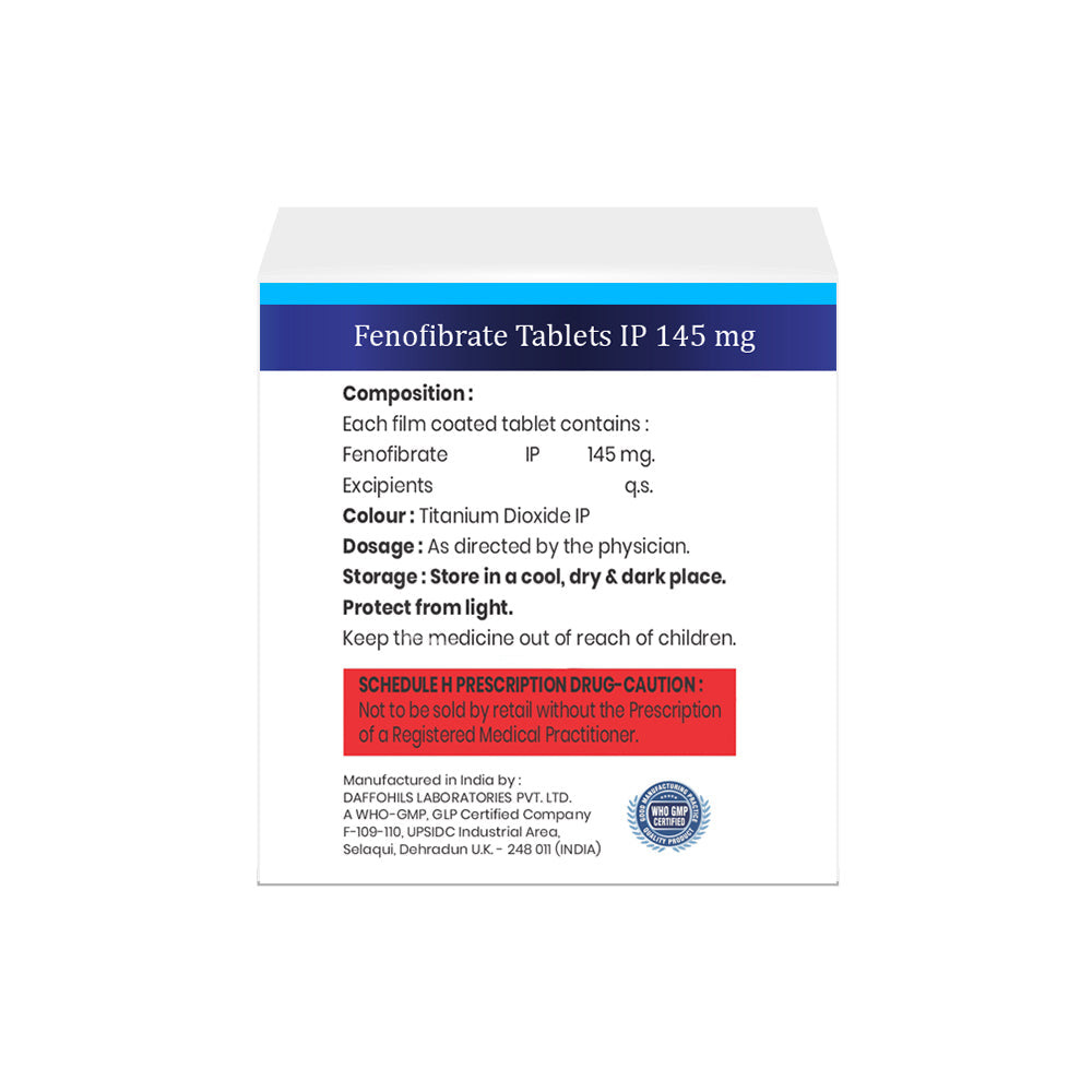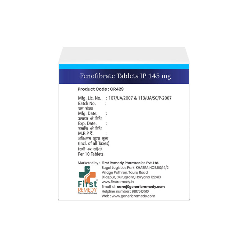 Fenofibrate 145 mg Tablets IP is an oral hypolipidemic medication used to lower elevated levels of lipids (fats) in the blood, including cholesterol and triglycerides. It is primarily prescribed for hypertriglyceridemia and mixed dyslipidemia.