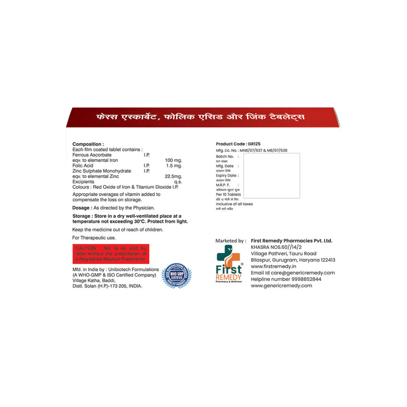 Ferrous Ascorbate 100mg, Folic Acid 1.5mg & Zinc Sulphate 22.5mg Tablets IP is a combination supplement containing iron (as Ferrous Ascorbate), folic acid, and zinc (as Zinc Sulphate) used to treat and prevent specific nutritional deficiencies.