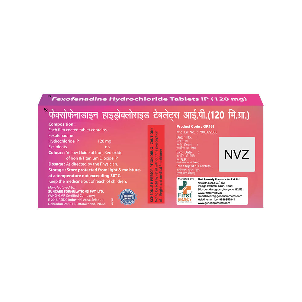 Fexofenadine Tablets IP 120 mg are primarily used to treat various types of allergies. Allergies occur when the immune system reacts to foreign substances called allergens, which are usually harmless. Allergic conditions vary among individuals and may include reactions to pollen, dust, pet dander, certain foods, and insect bites.