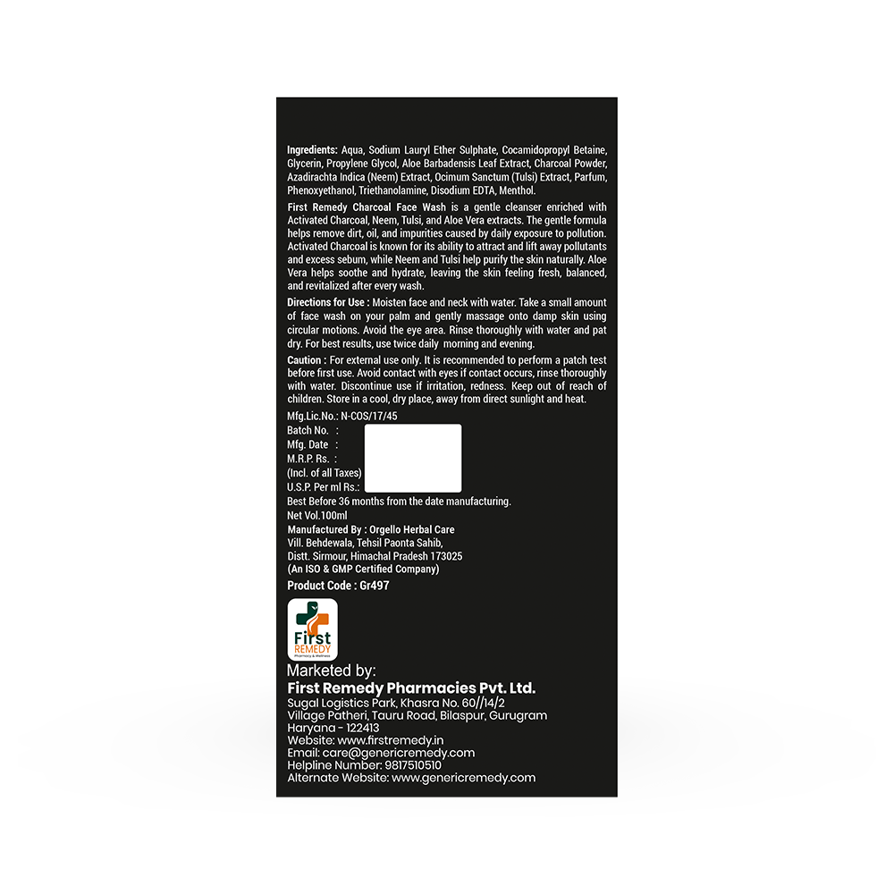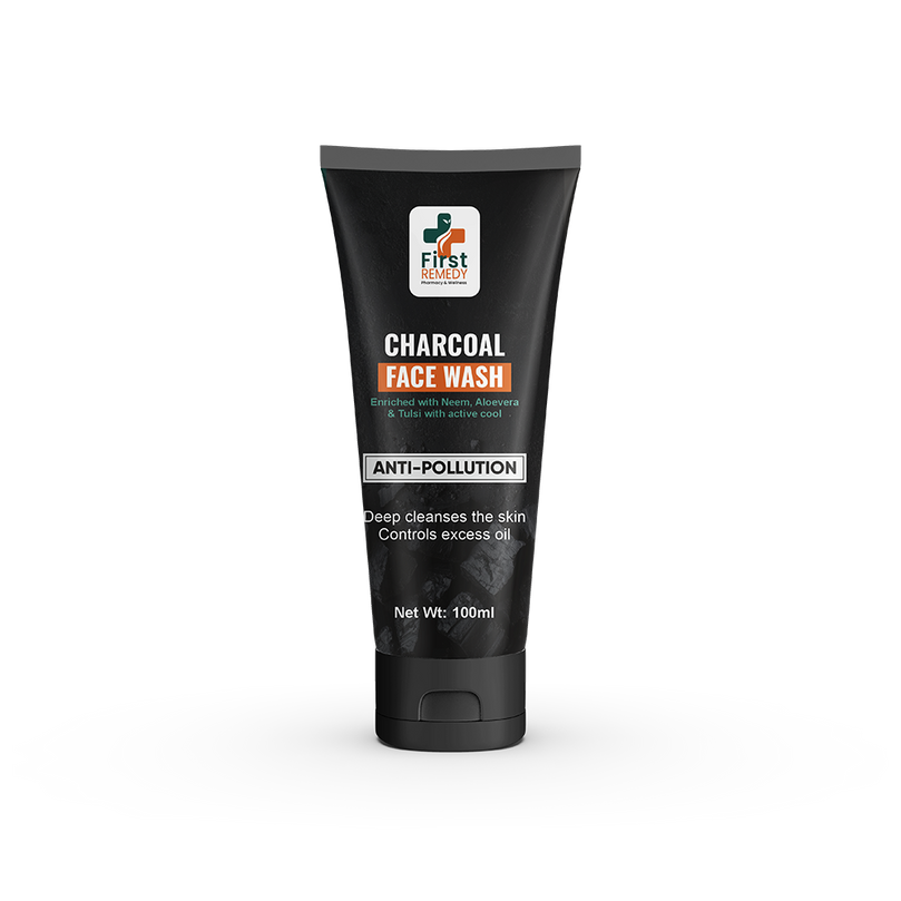 First Remedy Charcoal Face Wash is a gentle cleanser enriched with activated charcoal and natural extracts of Neem (Azadirachta Indica), Aloe Vera (Aloe Barbadensis), and Tulsi (Ocimum Sanctum).