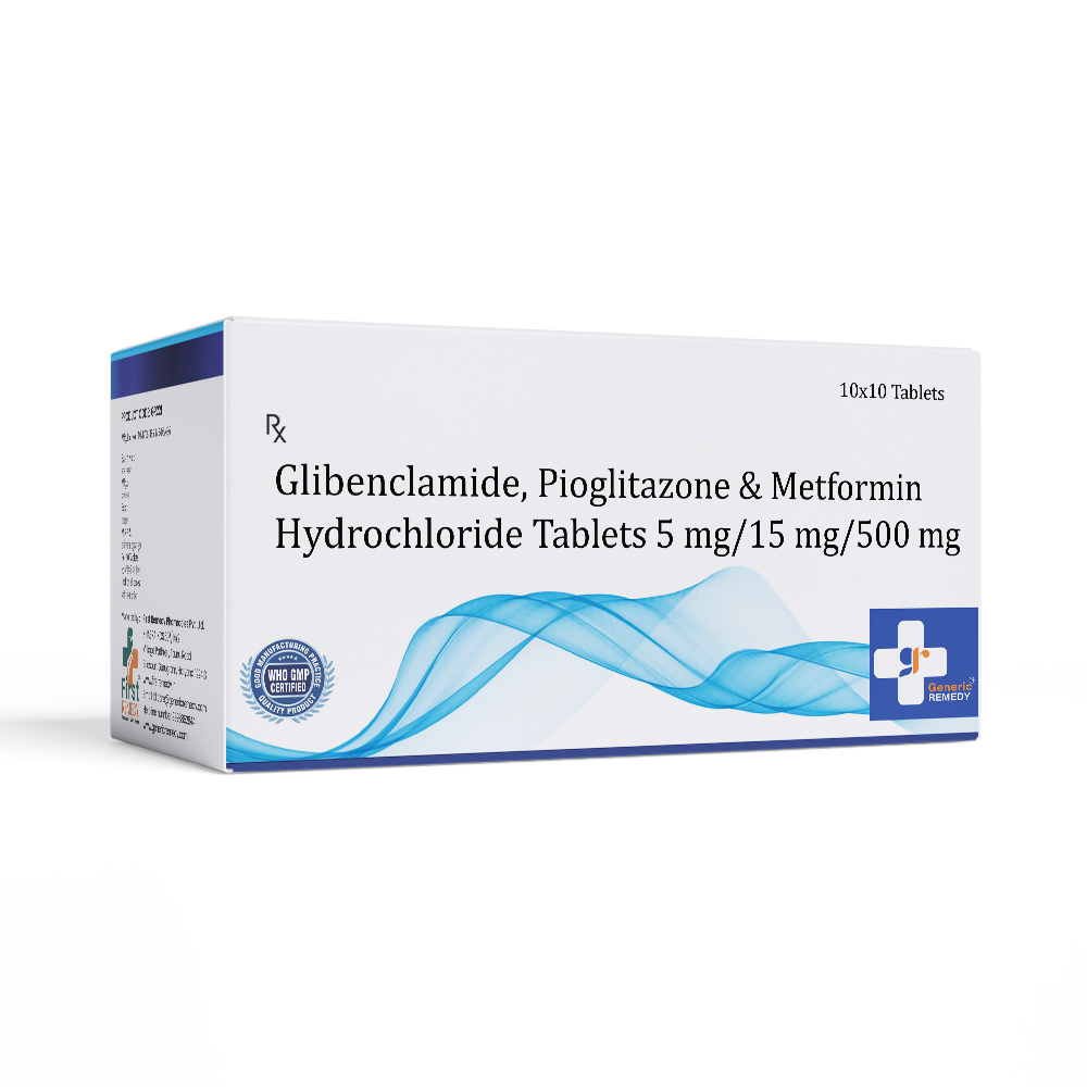 Glibenclamide 5 mg, Metformin 500 mg & Pioglitazone 15 mg Tablet is used in the treatment of Type 2 diabetes mellitus. Type 2 diabetes mellitus is a chronic condition characterized by elevated blood sugar levels due to insufficient insulin production or insulin resistance. This combination helps control blood sugar when single or dual therapies are inadequate.