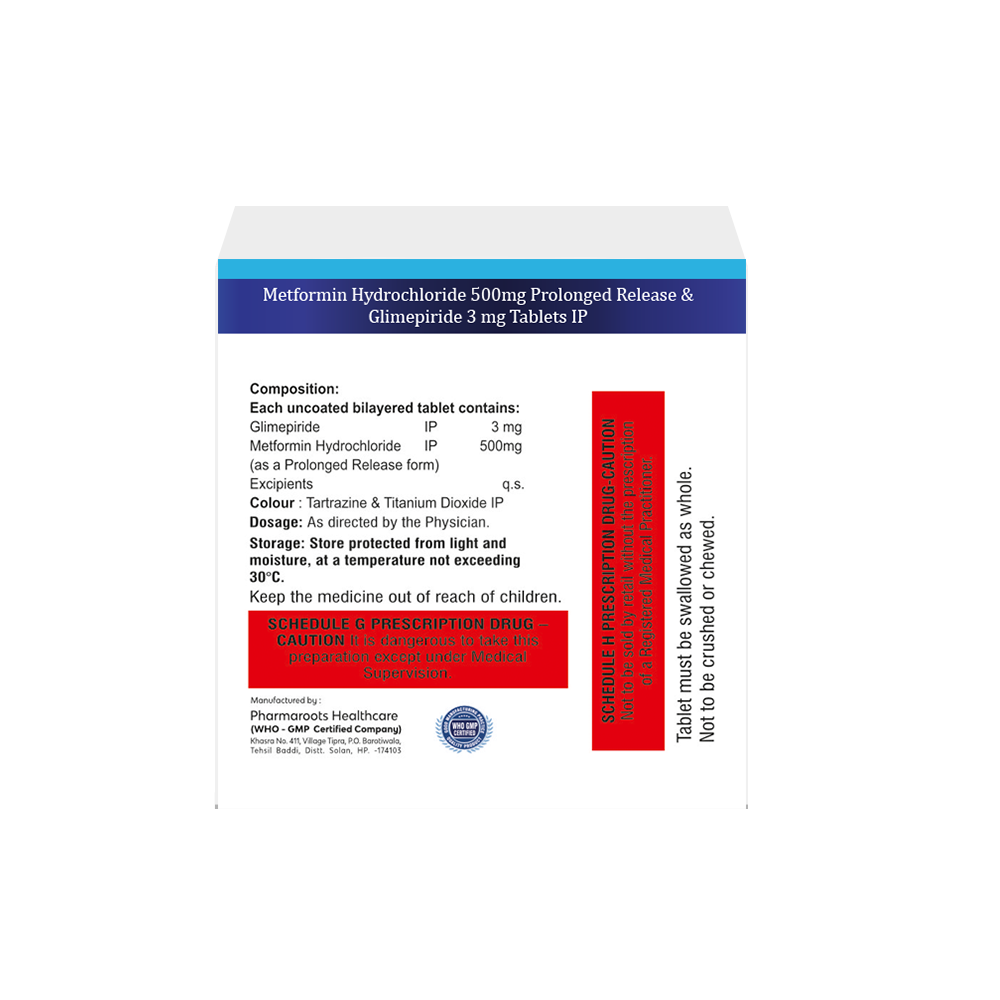 Glimepiride IP 3 mg & Metformin 500 mg Tablet PR is indicated in the treatment of type 2 diabetes mellitus.