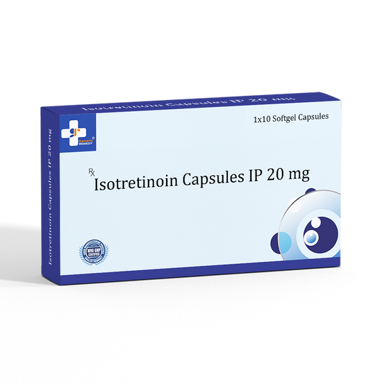 Isotretinoin 20 mg Soft Gelatin Capsules IP belong to a class of medications called retinoids (synthetic derivatives of vitamin A), primarily indicated for the treatment of severe recalcitrant nodular (cystic) acne that has not responded to adequate courses of oral antibiotics and topical therapies. Nodular acne involves deep, inflamed, tender lumps (nodules) under the skin due to excessive sebum production, clogged pores, bacterial overgrowth (e.g., Cutibacterium acnes), and inflammation, often leading to scarring if untreated.