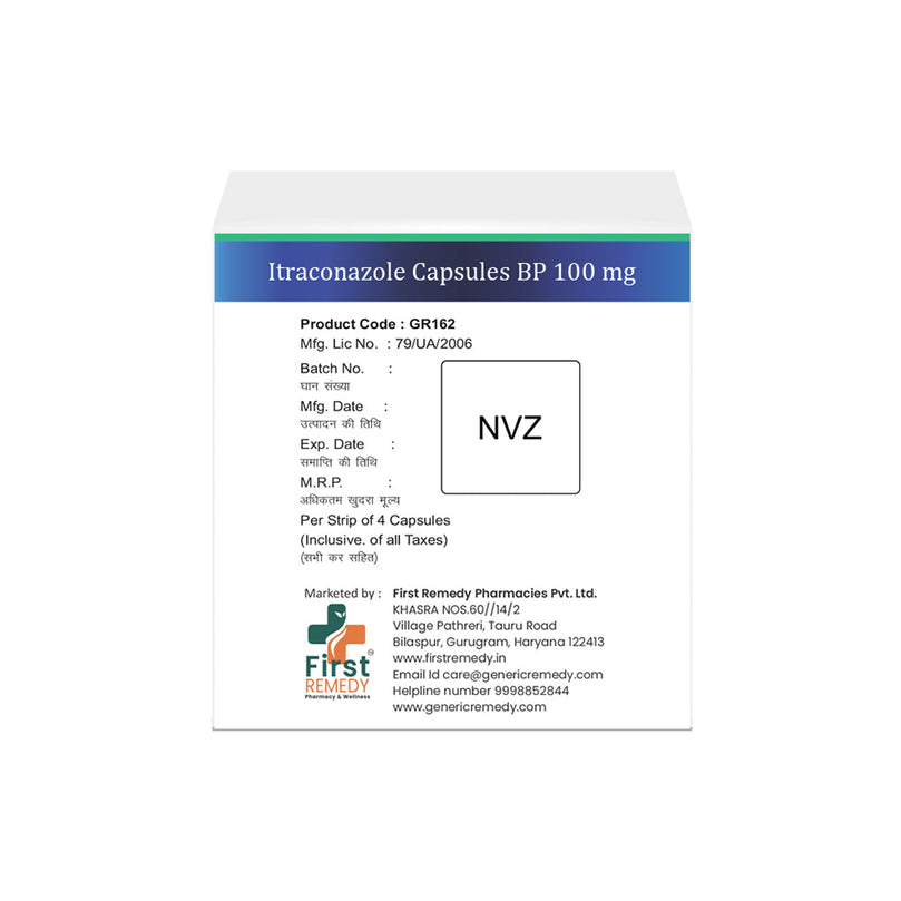 Itraconazole 100 mg Capsule IP is a triazole antifungal medication used to treat various fungal infections, including those of the mouth (oropharyngeal candidiasis), throat (esophageal candidiasis), nails (onychomycosis), skin, and lungs (e.g., aspergillosis, histoplasmosis).