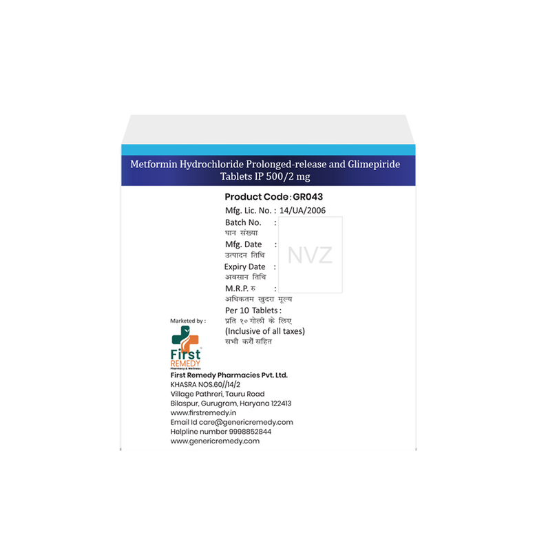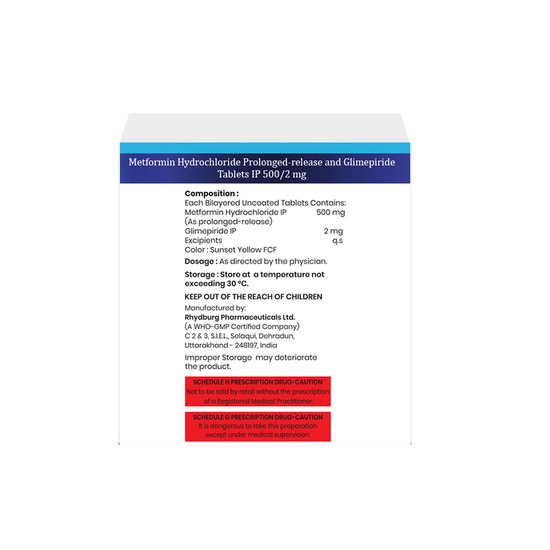 Metformin Hydrochloride Prolonged-release 500mg & Glimepiride 2mg Tablets IP is a combination anti-diabetic medication for adults with type 2 diabetes mellitus. It combines a biguanide (Metformin) that improves insulin sensitivity and reduces glucose production, with a sulfonylurea (Glimepiride) that stimulates insulin release. This formulation is used when diet, exercise, and single-agent therapy are insufficient to control blood sugar, helping prevent complications like heart disease and neuropathy.