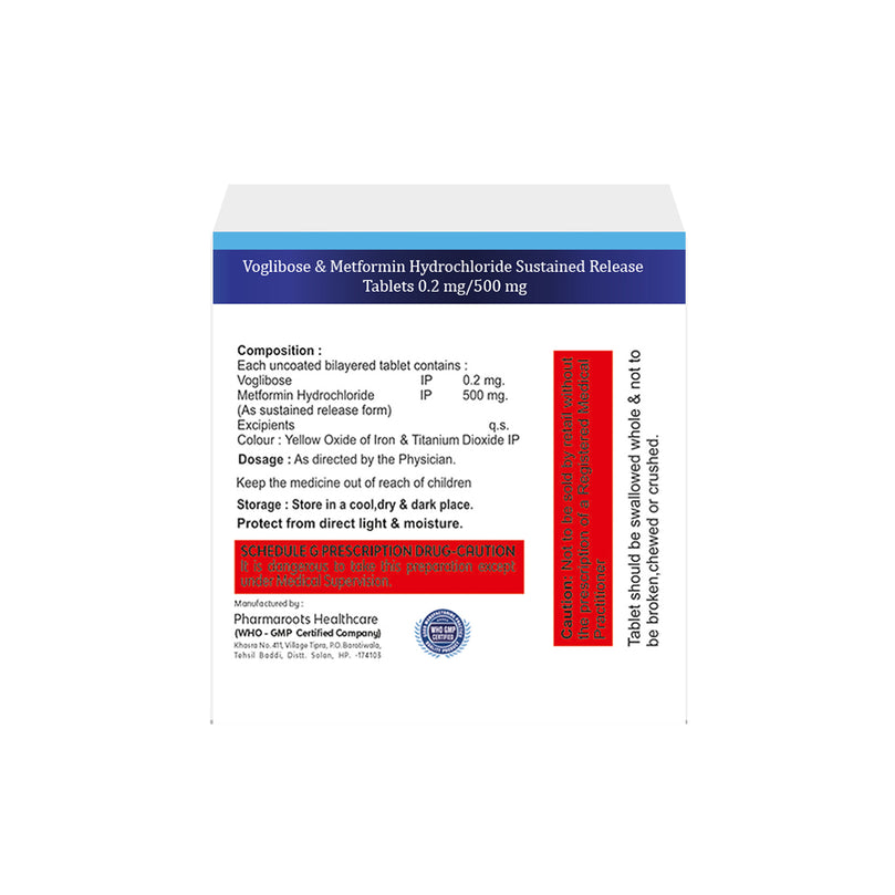 Metformin SR 500mg & Voglibose 0.2 mg Tablet IP may increase the risk of low blood sugar levels, especially with alcohol intake, exercise more than usual, delay or miss snacks or meals. However, if you experience any signs of low blood pressure, such as dizziness, nausea, light-headedness, dehydration, or fainting, please consult a doctor.