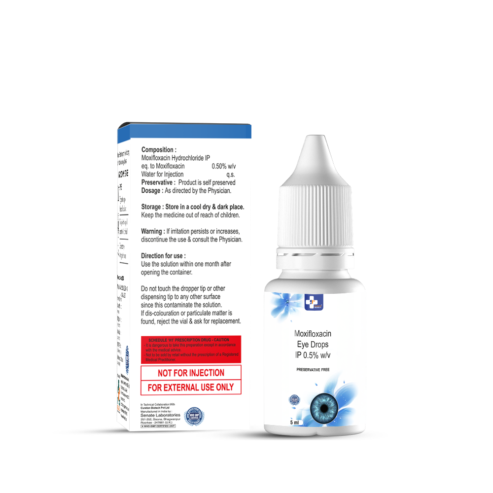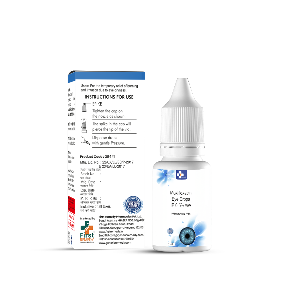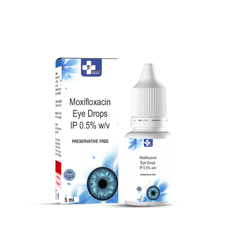 Moxifloxacin Hydrochloride Eye Drops IP 0.5% w/v are for ophthalmic use only. Wash your hands before and after application. Tilt your head back, pull down the lower eyelid to create a pocket, and instill the prescribed number of drops (usually 1–2 drops per eye, every 2–4 hours initially). Blink gently and avoid touching the dropper tip to prevent contamination. Do not wear contact lenses during treatment. If you miss a dose, apply it as soon as possible, but skip if it's near the next one—do not double up. Use for the full prescribed duration to prevent resistance.