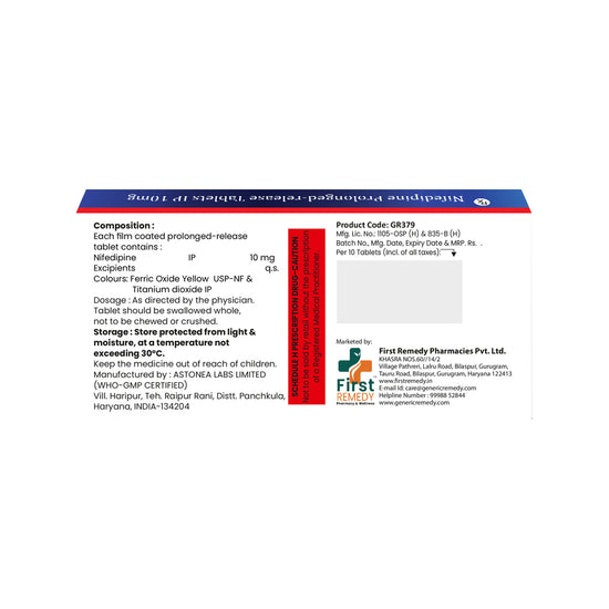 Nifedipine Prolonged Release Tablets IP 10 mg belong to a class of medications called calcium channel blockers (CCBs), specifically dihydropyridines, primarily used to treat hypertension (high blood pressure) and chronic stable angina pectoris (chest pain due to reduced blood flow to the heart).