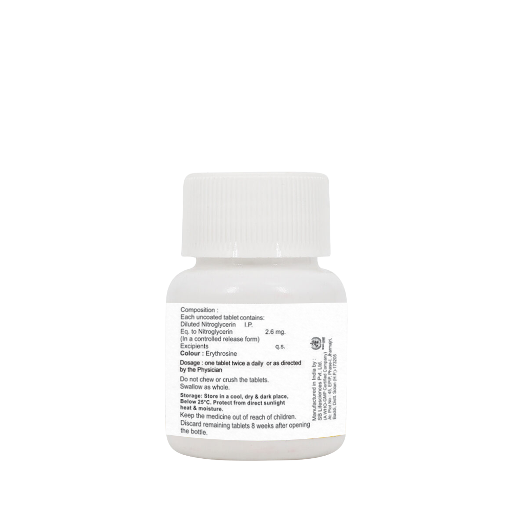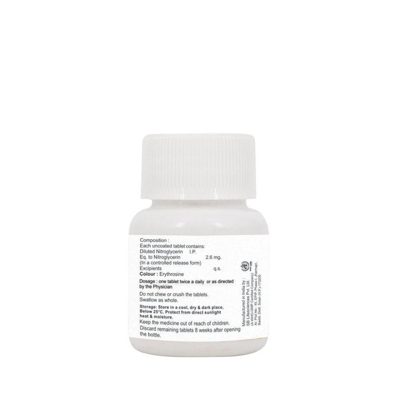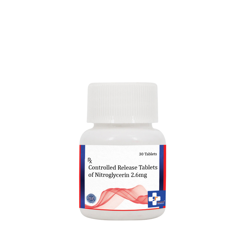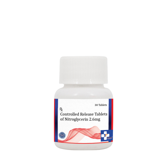 Nitroglycerin 2.6mg Controlled Release Tablet IP is a medication used to prevent and treat angina pectoris (heart-related chest pain). It belongs to the nitrate class of drugs, which act as vasodilators to relax and widen blood vessels.