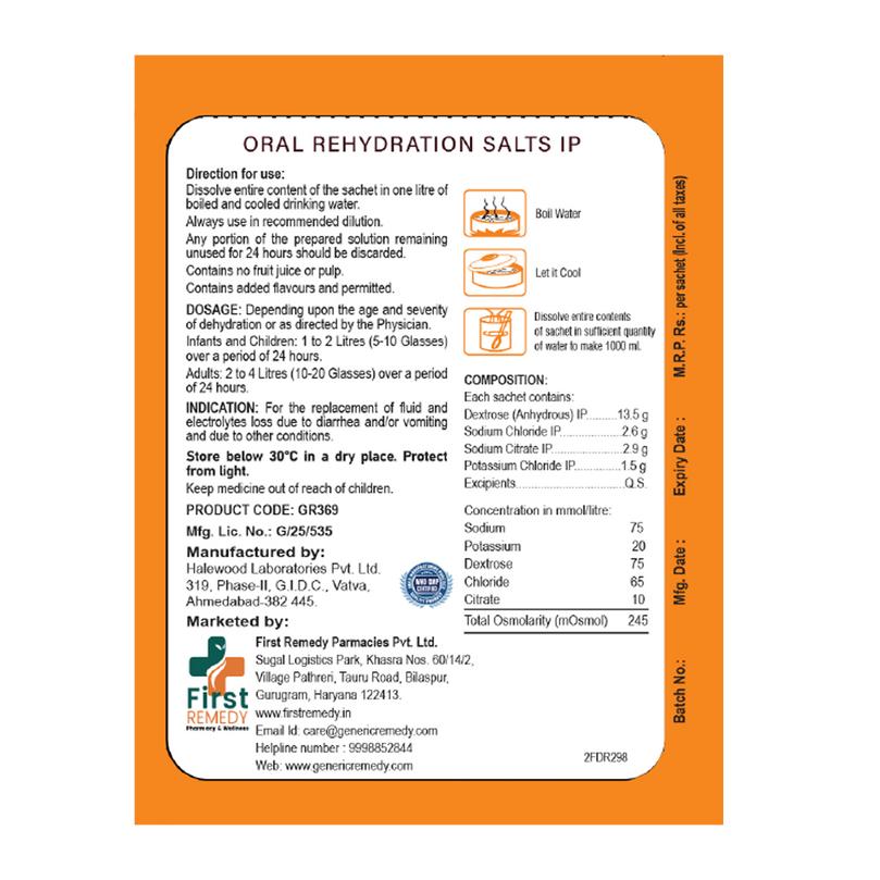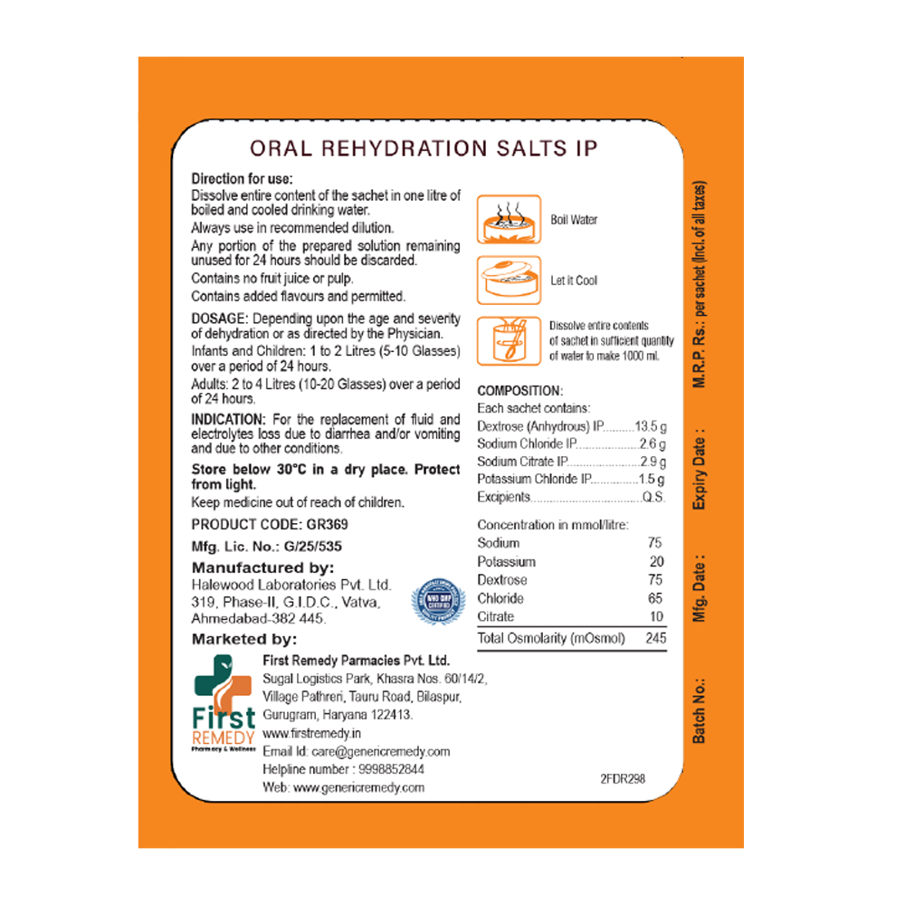 Oral Rehydration Salts IP (WHO Formula) Orange Flavour Sachet 21 gm is a scientifically formulated rehydration therapy used to prevent and treat dehydration caused by fluid and electrolyte loss. It is prepared as per World Health Organization (WHO) recommendations and complies with Indian Pharmacopoeia (IP) standards.