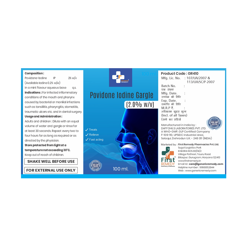 Povidone Iodine Gargle 2% w/v IP is a topical antiseptic and disinfectant oral rinse containing 2% w/v povidone-iodine (equivalent to 0.2% available iodine). It is an over-the-counter (OTC) formulation designed for mouth and throat use to kill or inhibit a broad spectrum of microorganisms causing infections. Povidone acts as a carrier for iodine, providing sustained release while reducing iodine's toxicity compared to elemental iodine solutions. It is commonly used for minor oral infections and as an adjunct in dental care.
