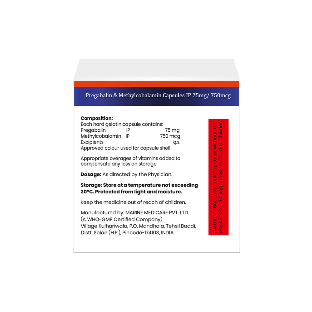 Pregabalin 75mg methylcobalamin 750mcg is a combination of two drugs: Pregabalin (antiepileptic) and Methylcobalamin (vitamin B12). Pregabalin enhances the transmission of signals in damaged nerves.. Methylcobalamin is a form of Vitamin B12 that helps regenerate damaged nerves and supports the production of the myelin sheath, the protective outer layer of nerves. Thus, Pregabalin 75 mg and Methylcobalamin 750 mcg Capsule support the healing of damaged nerves and enhance nerve conduction in conditions caused by diabetes or trauma.
