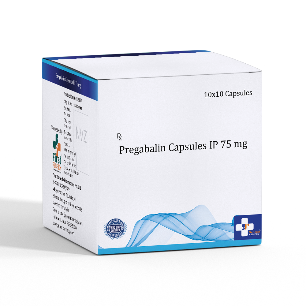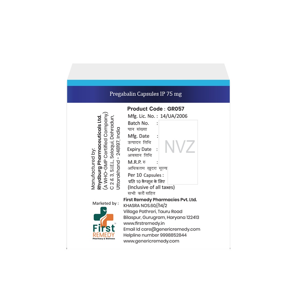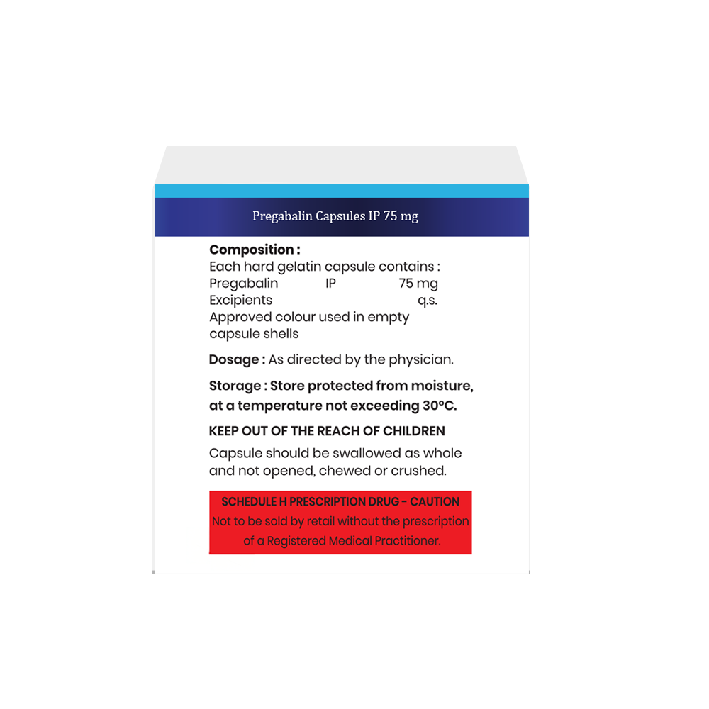 Pregabalin Capsules IP 75 mg is an anticonvulsant and neuropathic pain medication used to treat nerve pain associated with conditions like diabetic neuropathy, postherpetic neuralgia (nerve pain after shingles), and spinal cord injury.