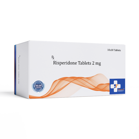 Risperidone Tablets IP 2 mg is an atypical (second-generation) antipsychotic medication used to treat mental health conditions by rebalancing neurotransmitters like dopamine and serotonin in the brain. It is indicated for schizophrenia (hallucinations, delusions, disorganized thinking, social withdrawal), acute manic or mixed episodes in bipolar I disorder (elevated mood, irritability, hyperactivity), and irritability associated with autistic disorder (aggression, self-injury, tantrums).