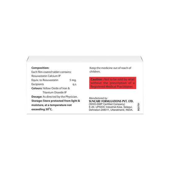 Rosuvastatin 5 mg Tablet IP contains Rosuvastatin, an HMG-CoA reductase inhibitor (statins), which helps lower bad cholesterol.