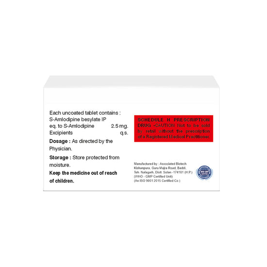 S-Amlodipine Tablets 2.5 mg IP contains 'S-amlodipine', a calcium channel blocker that acts by relaxing the blood vessels. This reduces the heart's workload and makes the heart more efficient at pumping blood throughout the body. Thus, it helps to lower high blood pressure, reducing the chances of a heart attack or stroke.