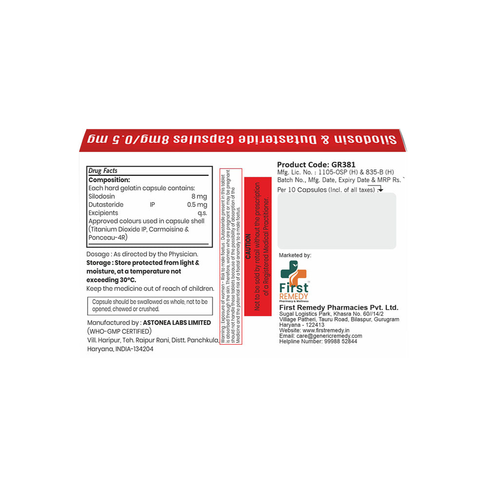 Together, Silodosin 8 mg & Dutasteride 0.5 mg Capsules IP offer both fast symptom relief and long-term disease control, reducing the risk of acute urinary retention and the need for prostate surgery. This medicine is intended for adult men only and does not cure prostate cancer.