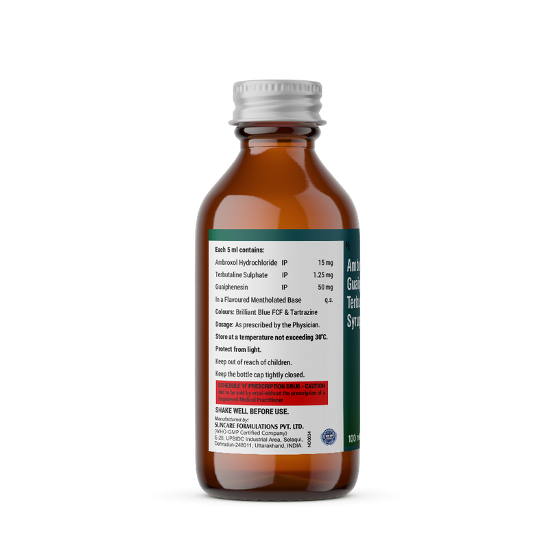 Terbutaline 1.25 mg, Ambroxol 15 mg, Guaifenesin 50 mg & Menthol per 5 ml Syrup 100 ml IP is a combination expectorant syrup used to relieve cough associated with excessive mucus (productive or wet cough).